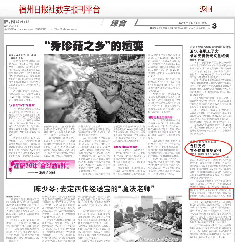 2019年8月12日,福州日報報道:臺江區信用辦近日成功協助一家企業完成信用修復。日前,臺江區信用辦與福建信盾信用管理公司共同舉辦了臺江區第一期信用修復培訓班,對部分信用待修復的企業及相關人員進行了信用修復培訓。