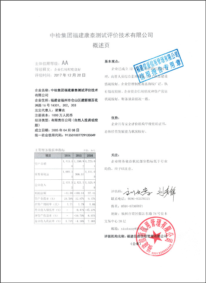 中檢集團福建康泰測試評價技術有限公司 XDPJ201712203